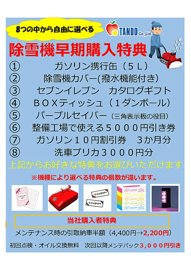 ① ずーっと除雪機メンテパック割引!
